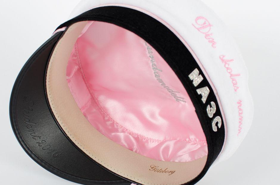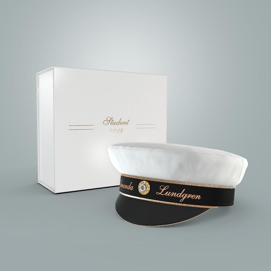 Amanda Lundblad har valt exklusiva tillval på sin studentmössa. Quiltat innerfoder, vit Memorial Box och Diamantkokard.Se exakt hur Amanda har designat sin studentmössa!