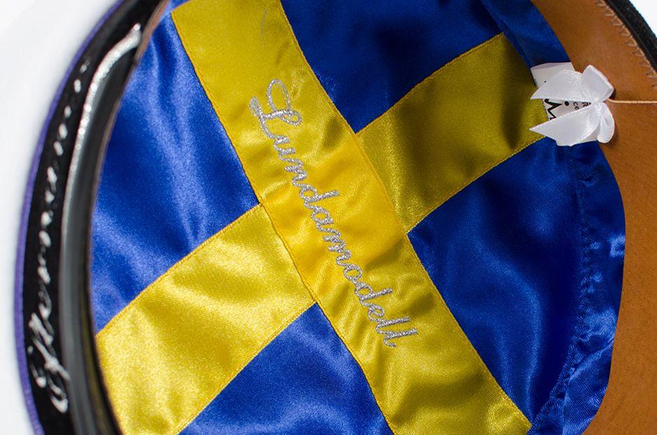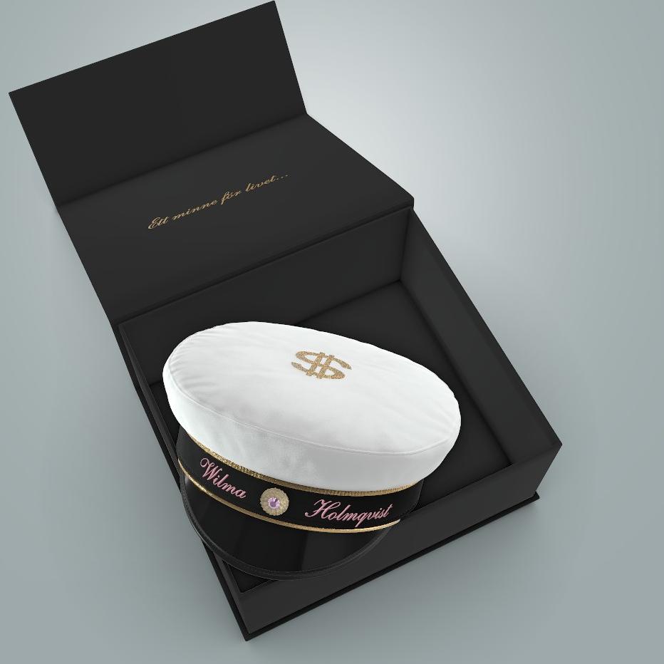Ebba Lindblad har valt Sverigeflaggan som innerfoder i sin studentmössa, även skärmgravyr, kalvskinn matt skärm och Memorial Box.Inspireras av Ebbas studentmössa!